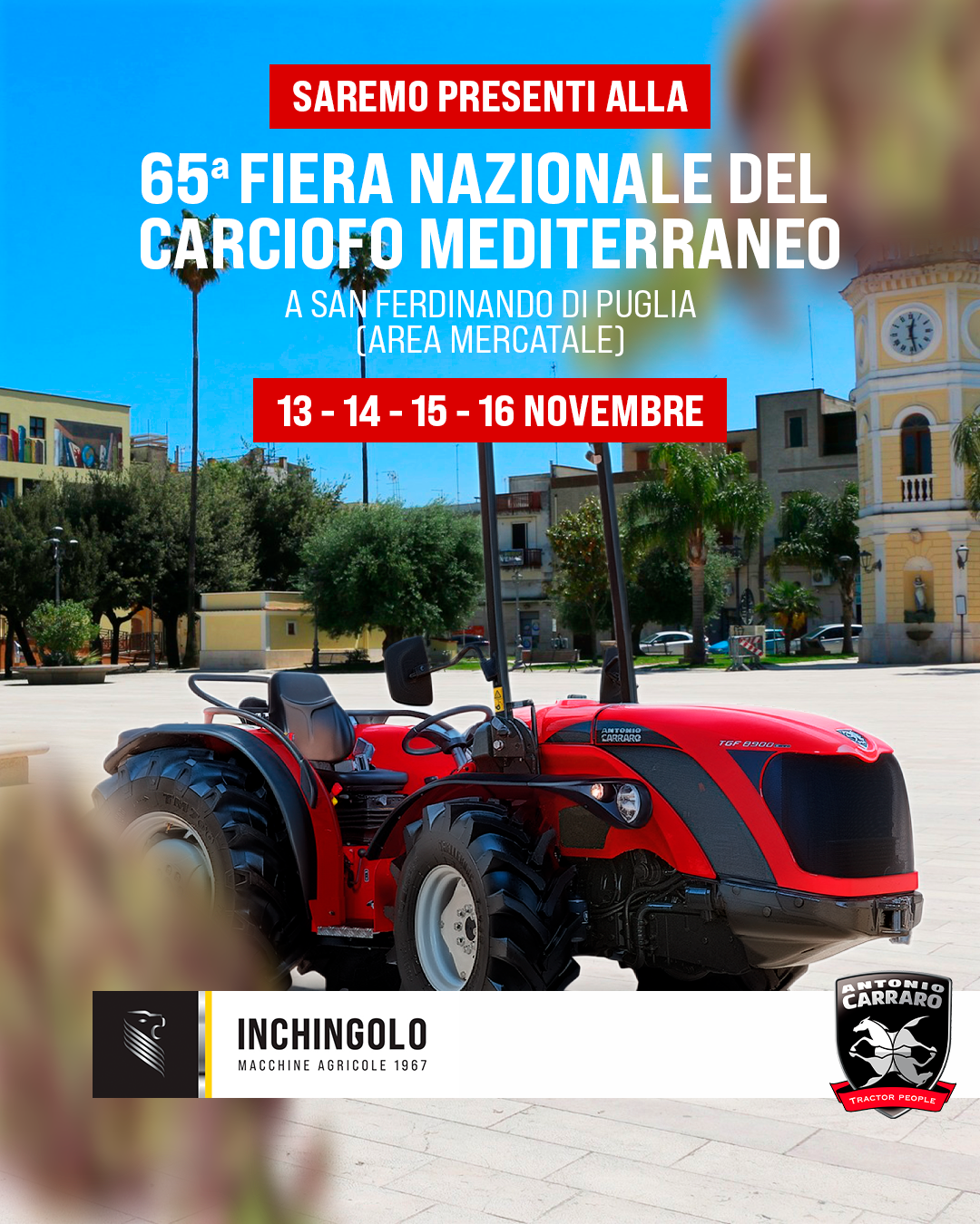 Inchingolo Trattori alla 65ª Fiera Nazionale del Carciofo Mediterraneo! Dal 13 al 16 novembre saremo presenti a San Ferdinando di Puglia con uno stand interamente dedicato al mondo Antonio Carraro. Un’occasione perfetta per scoprire da vicino i trattori compatti e versatili che stanno ridefinendo il concetto di efficienza in campo. Vieni a trovarci, scopri la