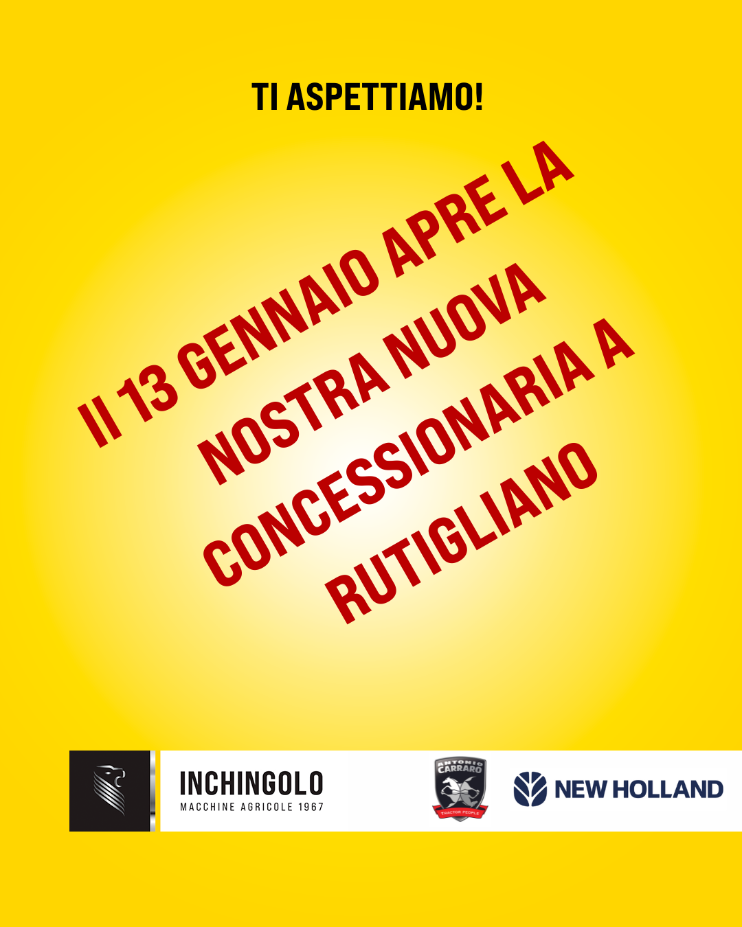 Ci siamo: il 13 gennaio 2026 apriremo le porte della nostra nuova concessionaria a Rutigliano. Nell’attesa dell’inaugurazione ufficiale che avverrà nei prossimi giorni, noi di Inchingolo inizieremo ad erogare tutti i nuovi servizi dedicati agli agricoltori del territorio: – Un ampio showroom con una vastissima scelta di macchinari agricoli all’avanguardia; – Consulenza e sviluppo di