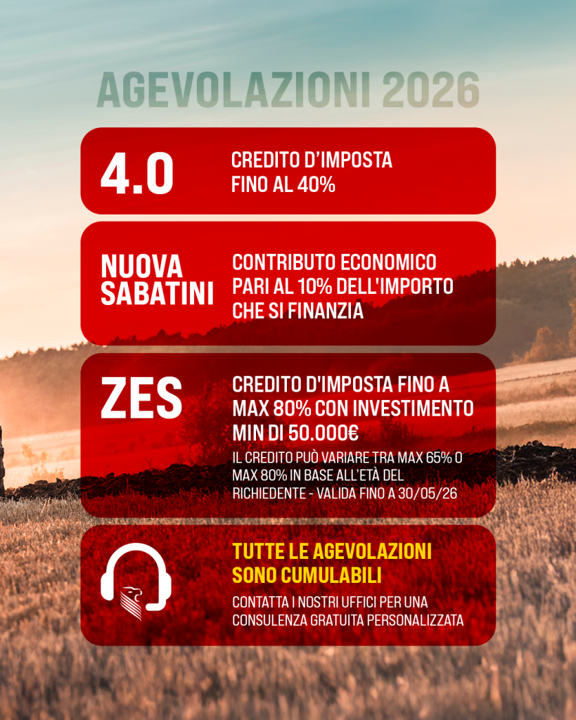 - ZES Unica: credito d’imposta fino a un massimo dell’80%, con investimento minimo di 50.000 € – l’agevolazione può variare tra max il 65% o max l’80% in base all’età del richiedente ed è valida fino al 30/05/2026